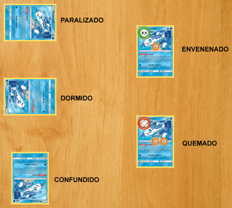 Confuso: Siempre que el Pokémon quiera atacar, el jugador cuyo Pokémon padece la condición lanza una moneda, si el resultado es cruz, el Pokémon recibe 3 contadores de daño.